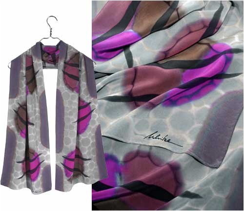 BEST BUY.. ULRIKE Oblong Crepe de Chine Silk Scarf - Pods of magenta, mauve and nutmeg flanked by patches blending purple and teal on a field of pale slate circles edged in cream.